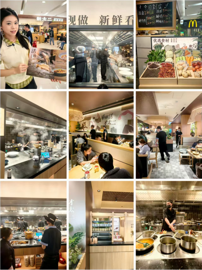 瑕瑜漫画风门店调度为原木色调的明档厨房,中央厨房预制配送的鱼片被“活鱼现杀”风物取代,新增了鲜鸡、鲜牛肉等菜品。