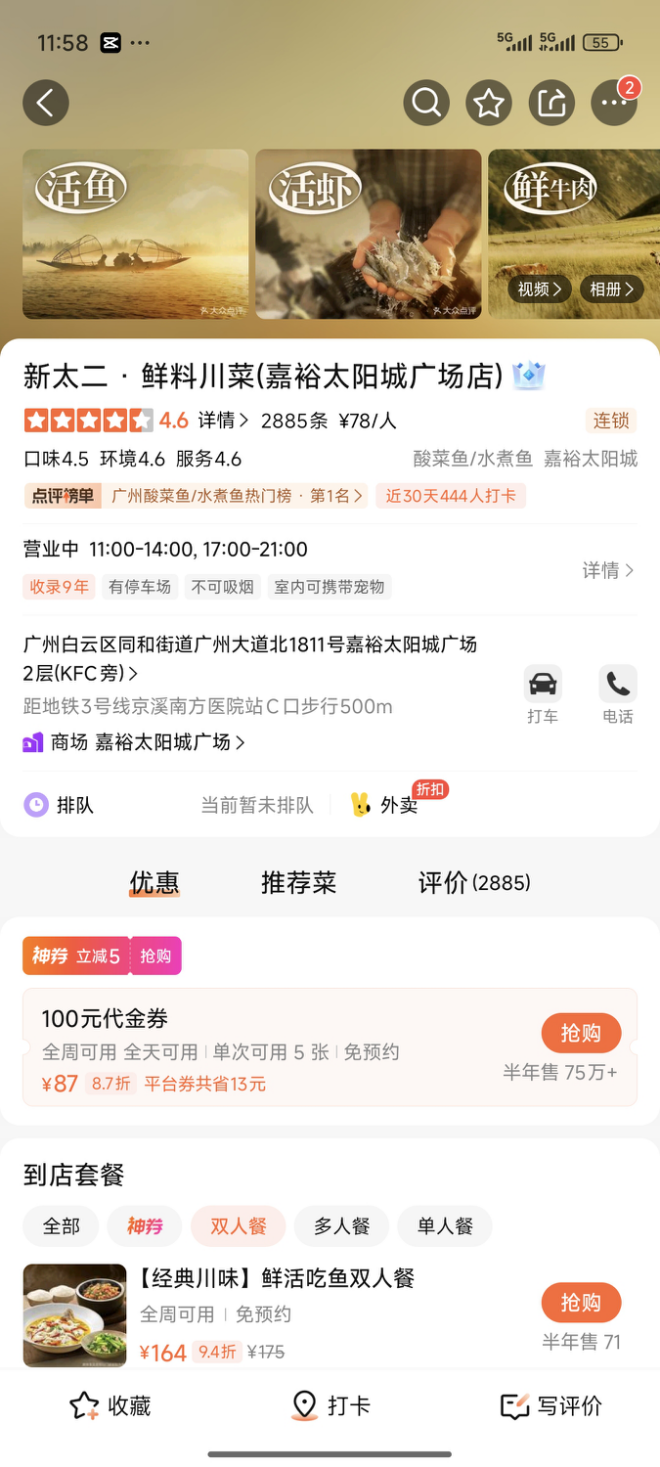 为了撑抓百元以上双东谈主餐的订价底气,订价率先围绕“活鱼、鲜鸡、鲜牛、鲜虾、鲜猪肉”五大鲜料品类拓荒价值感,把“活鱼现制”“鲜切吊龙”“烈火快炒”“15分钟出餐”等工艺与食材崭新度看成溢价原理。