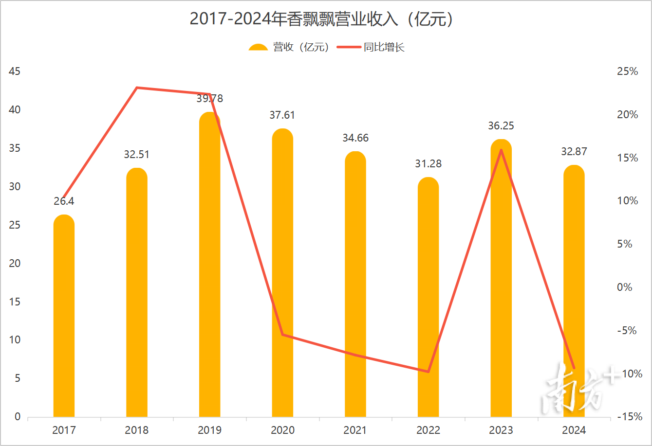 纵不雅香飘飘近8年营收情况,2017-2019年,香飘飘每年的营收皆保合手踏实的增长。2020年运转,受疫情影响的香飘飘营网罗结三年呈下降态势。尽管2023年反弹至36亿元,但仍不足2020年营收。2024年,香飘飘营收再度下落,营收追思到2018年水平。